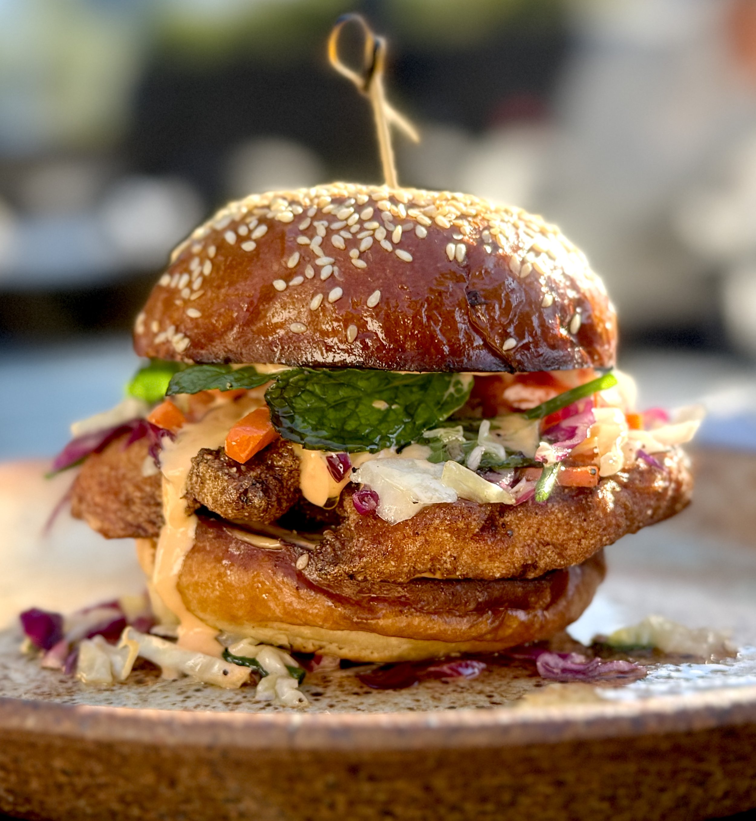 vinegar slaw, fresno aioli, dill pickles, baked bar sesame bun 24