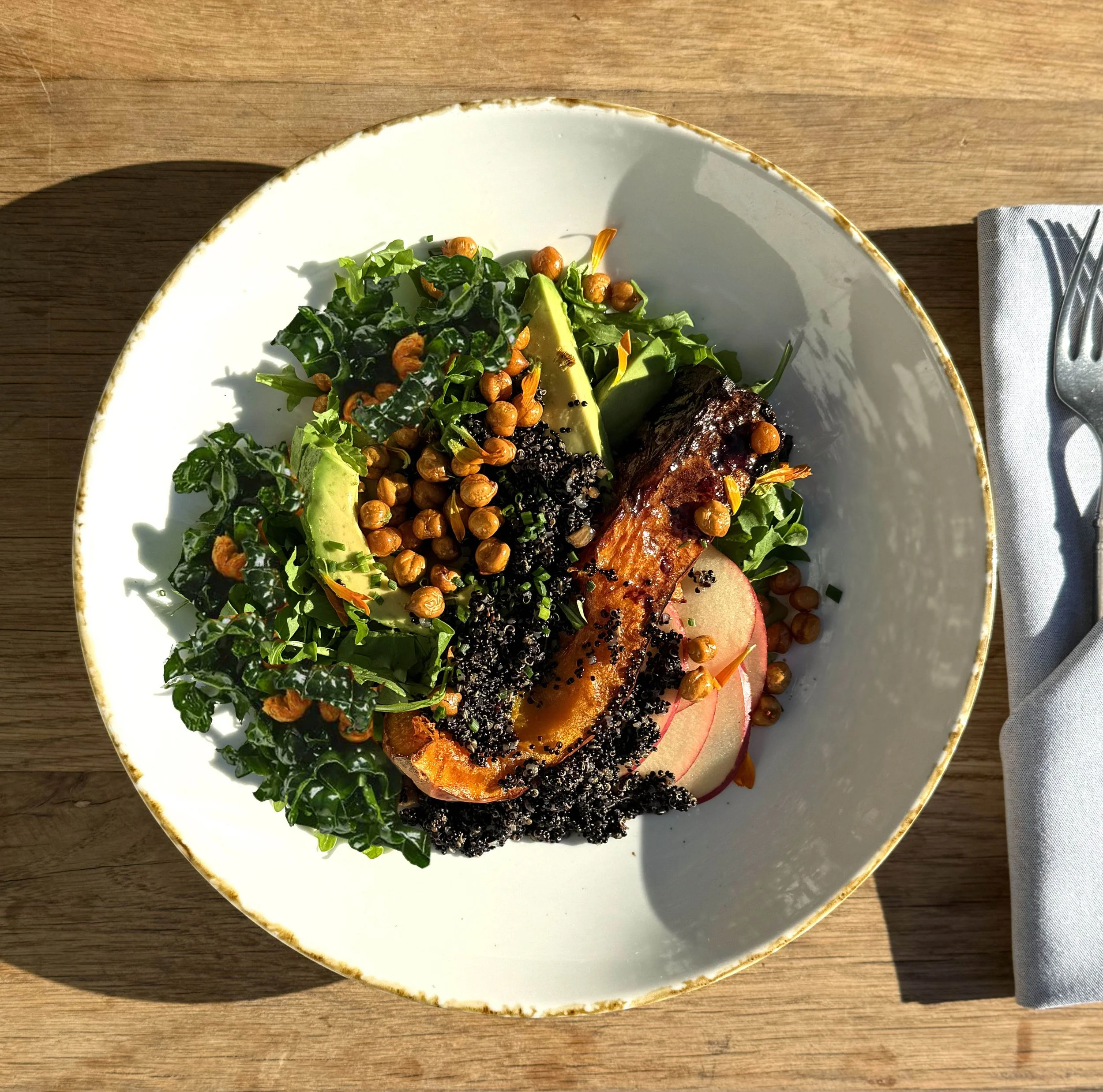 quinoa, butternut squash & kale, apples, roasted almonds & cranberries, crispy garbanzos, avocado & apple cider vinaigrette 25