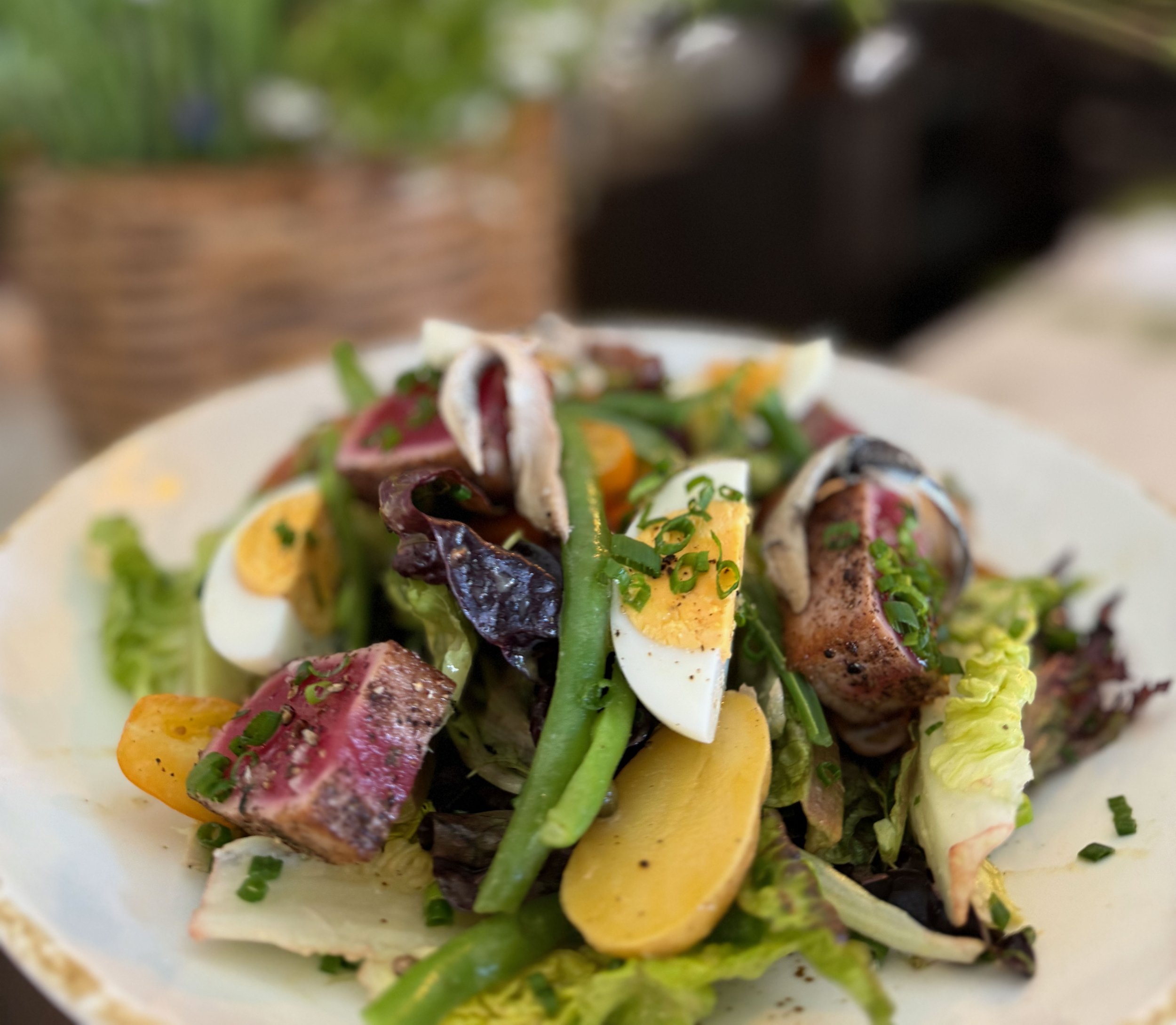 rare seared tuna, capers & weiser’s potatoes, gloria’s tomatoes & boiled egg, chives, nicoise olives, green beans, white anchovies, red wine vinaigrette, red & green gem 35